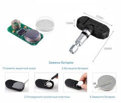 * Примечание: Возможность замены батарейки во внутренних датчиках является преимуществом данной системы, что выгодно отличает её от большинства подобных систем TPMS, представленных на рынке. Датчики с незаменяемой батарейкой по истечении срока её службы (~5 лет) подлежат замене на новые датчики, что равносильно покупке новой TPMS.